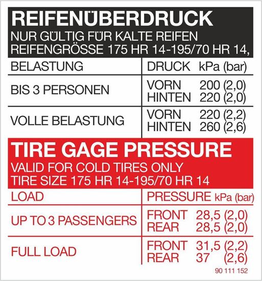 Opel Manta B / Kadett C replacement Tire Pressure Decal / Sticker